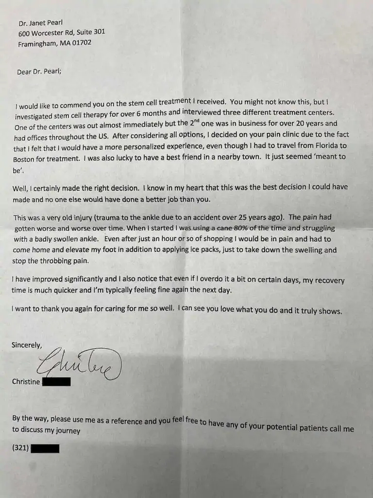 I would like to commend you on the stem cell treatment I received. You might not know this, but I investigated stem cell therapy for over six months and interviewed three different treatment centers. One of the centers was out almost immediately but the 2nd one was in business for over 20 years and had offices throughout the US. After considering all options, I decided on your pain clinic due to the fact that I felt I would’ve have a more personalized experience, even though I had to travel from Florida to Boston for treatment. I was also lucky to have a best friend in the nearby town. It just seemed ‘meant to be.’